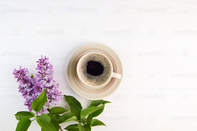 Ветки сирени и чашка кофе на белом деревянном фоне. Весенний фон