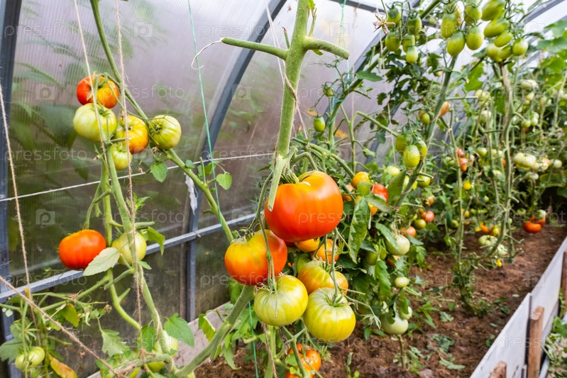 Спелые красные и незрелые зеленые помидоры в теплице