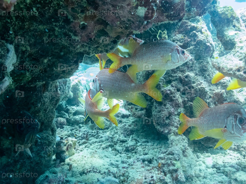 Стая мелких экзотических рыб в глубинах Индийского океана, Мальдивы, концепция путешествия