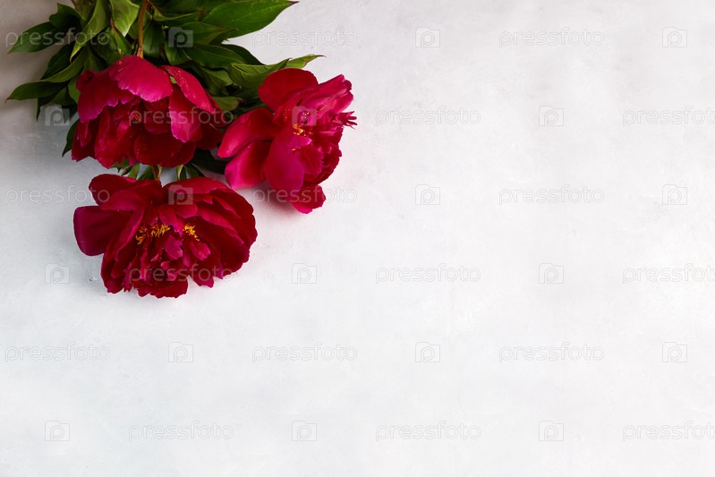 Красивые цветущие красные цветы пиона на сером фоне. Вид сверху, пространство для копирования