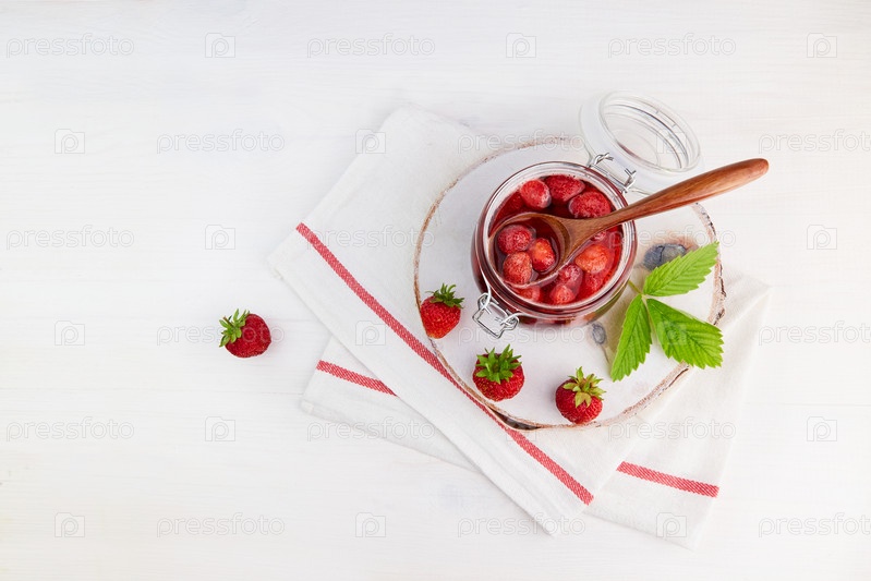 Домашнее клубничное варенье в стеклянной банке на белой деревянной доске