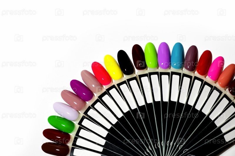 Образцы разноцветных гель-лаков для маникюра. Палитра цветов ногтевого сервиса и дизайна. Типсы с цветными лаками на белом фоне