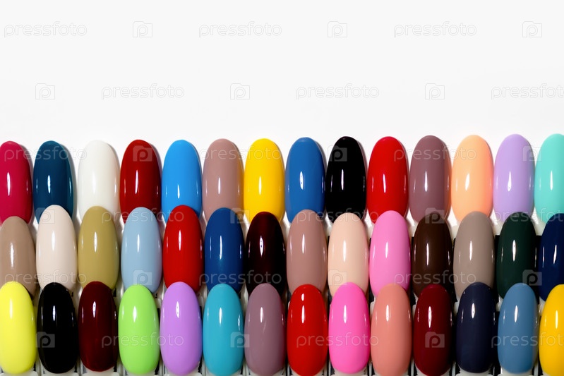 Образцы разноцветных гель-лаков для маникюра. Палитра цветов ногтевого сервиса и дизайна. Типсы с цветными лаками на белом фоне