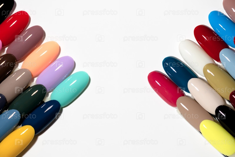 Образцы разноцветных гель-лаков для маникюра. Палитра цветов ногтевого сервиса и дизайна. Типсы с цветными лаками на белом фоне