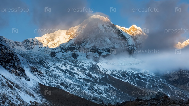 Первые солнечные лучи, освещающие вершину горы Аннапурна на юге на восходе солнца, базовый лагерь Аннапурны, заповедник Аннапурны, Гималаи, Непал