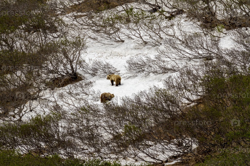 Голубые медведи (Ursus arctos beringianus) идут по снежному холму.Камчатка, Россия