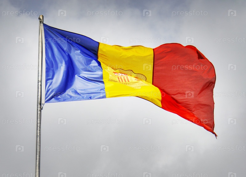 Флаг Андорры развевается на ветру на фоне серого неба