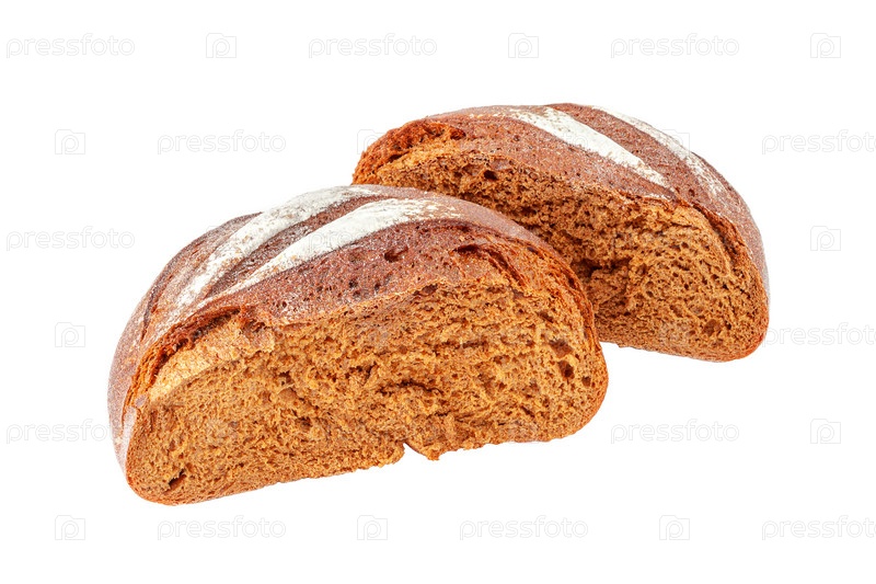 Две половинки круглой буханки черного бородинского ржаного хлеба. Аромат свежеиспеченных булочек