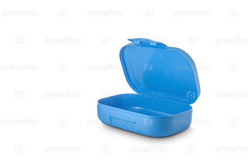 Откройте пустую пластиковую синюю коробку для завтрака на белом фоне