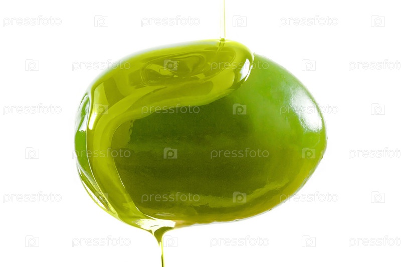 Масло течет на большие зеленые оливки. Крупный план на белом фоне
