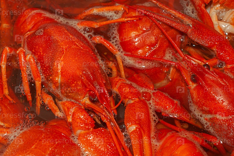 Красные раки в кипящей воде. Крупный план, выборочный фокус. Приготовление закусок