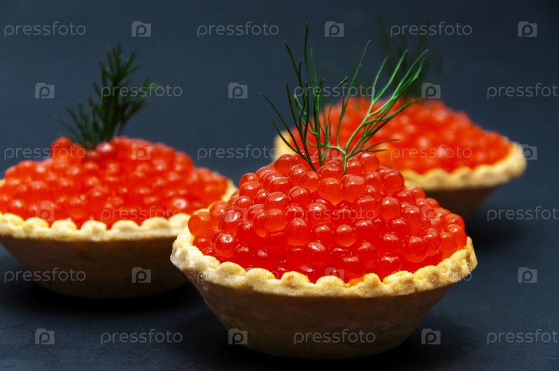 Красная и черная икра в тарталетках на черном фоне