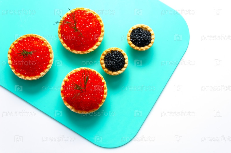 Красная и черная икра на синем подносе со столовыми приборами и тарталетками
