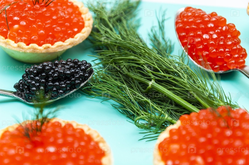 Красная и черная икра на синем подносе со столовыми приборами и тарталетками