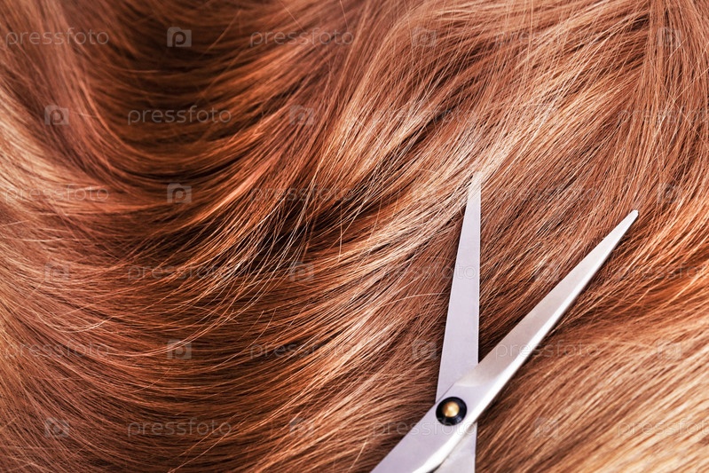 Натуральные ярко-каштановые волосы и ножницы, лежащие на нем. Выборочный фокус. Вид сверху. Концепция фона, ухода за волосами, стрижки