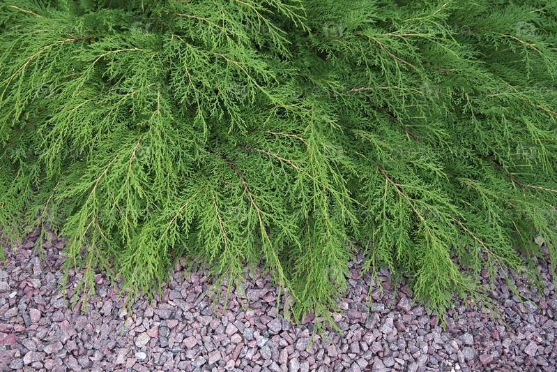 Зеленые кустарники микробиоты decussata на фоне цветного гранита