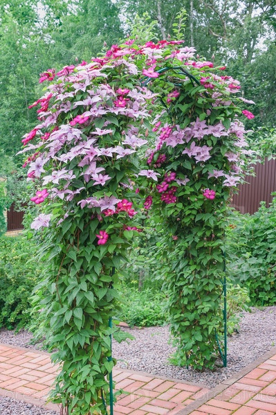 Арка с розовыми и бордовыми клематисами. Мягкий фокус. Вертикальный формат фото. Концепция выбора, сочетание вьющихся растений и ландшафтный дизайн для садов, парков