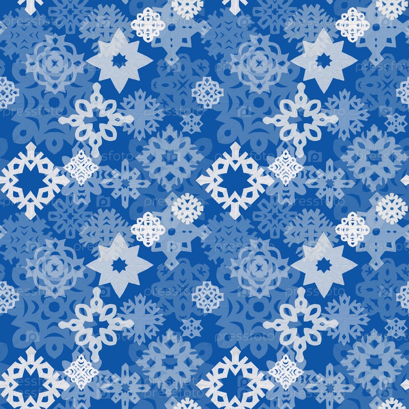 Бесшовный паттерн с бумажными прозрачными снежинками на синем джинсовом фоне