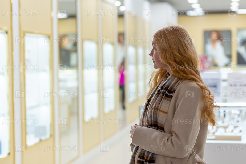 Молодая женщина смотрит на витрину магазина и ювелирные изделия, чтобы посмотреть на нее поближе, красивая студентка-блондинка-модель в торговом центре ювелирных изделий