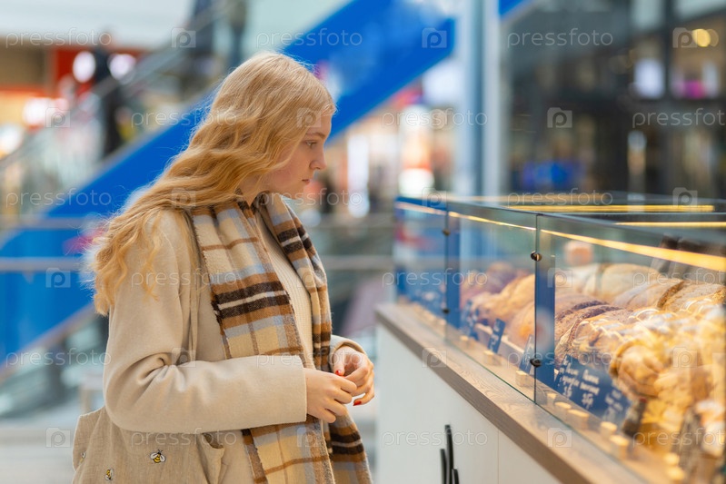 Женщина в белом халате и шарфе смотрит на витрину пекарни, полную разных кусочков тортов