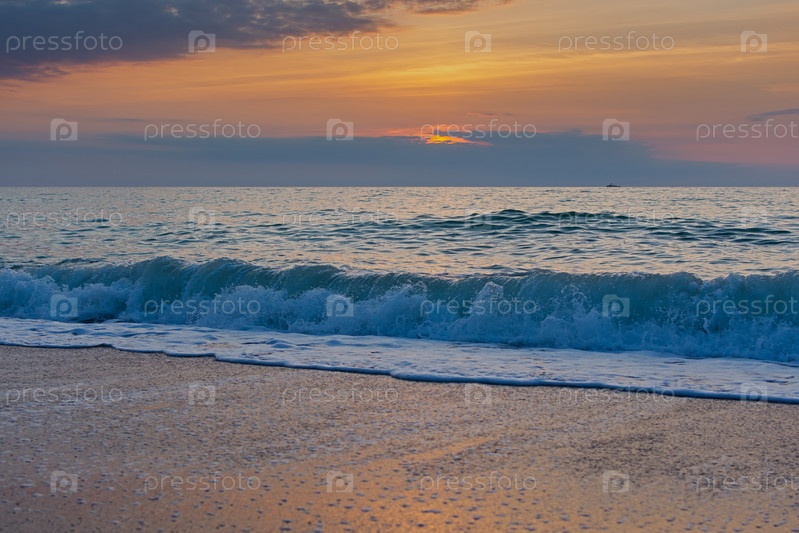 Оранжевый морской закат. Красивое солнце садится за большое облако. Теплый перламутровый свет. Летний фон без людей. Концепция отдыха, релаксации, уединения. Маленькие волны накатывают на берег