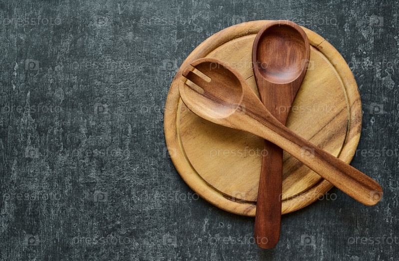 Кухонная утварь, деревянные салатные ложки лежат крест-накрест на круглой разделочной доске в винтажном стиле. Вид сверху с местом для копирования