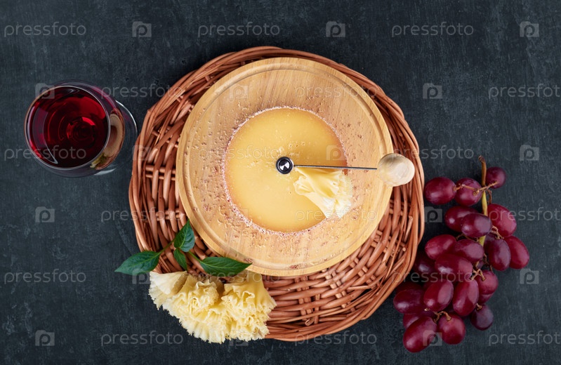 Изысканный вкусный сыр Тет де Муан, бокал красного вина и гроздь винограда, вид сверху, неглубокая глубина резкости