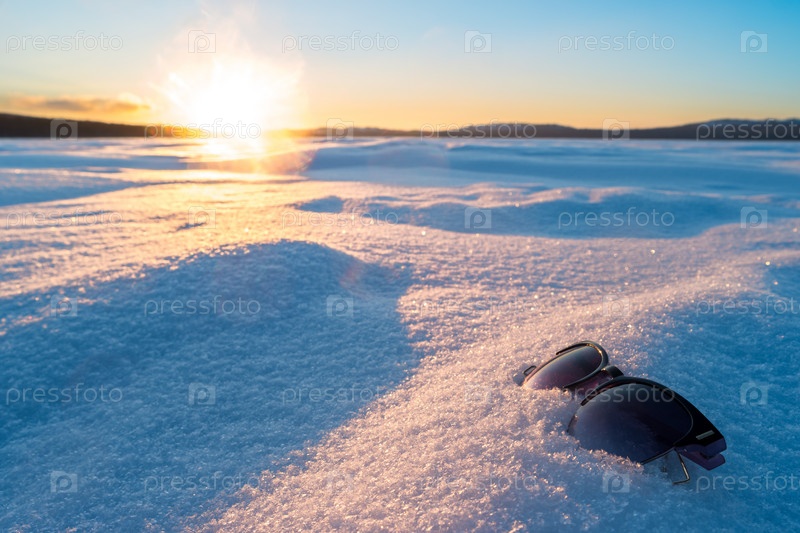 Солнцезащитные очки лежат на снегу, на фоне заходящего солнца. Зимняя природа России, на озере Зюраткуль