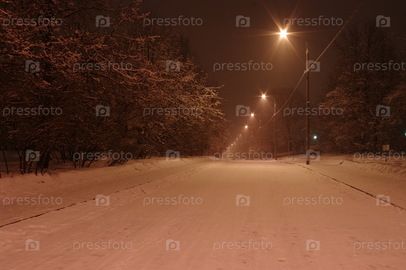 Пустая заснеженная улица с фонарями