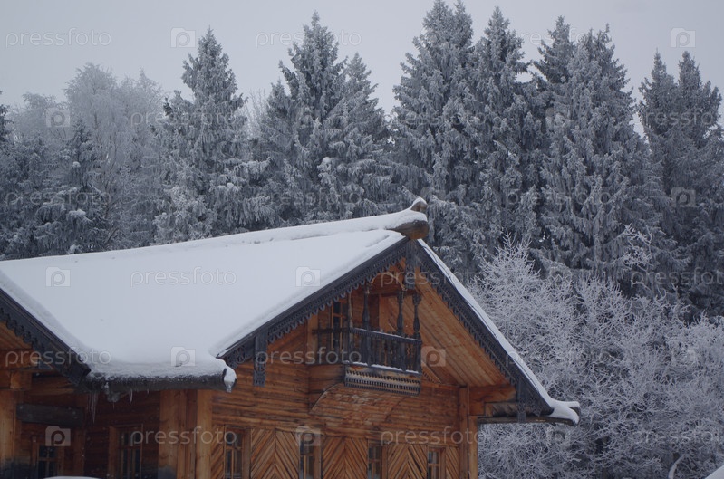Крыша деревянной русской крестьянской избы, покрытая снегом