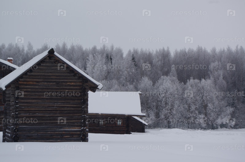 Русская деревянная изба зимой на фоне леса