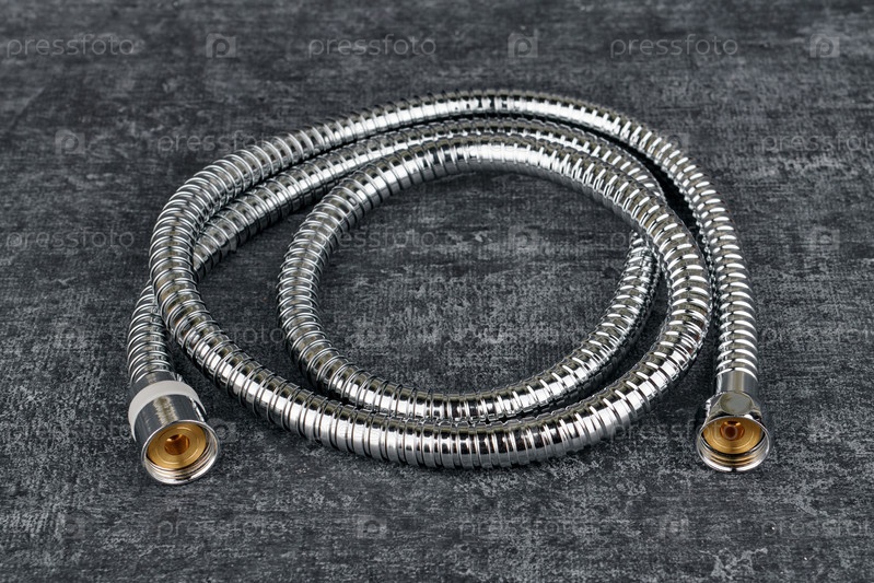 Железный водяной шланг для душа на сером фоне, крупным планом