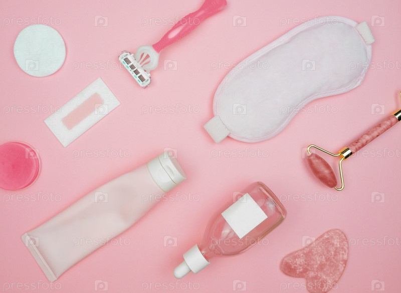 Раскладка предметов по уходу за лицом и телом на розовом фоне, очищающий гель, сыворотка, ролик для лица, гуаша, бритва, маска, ватный диск, бальзам, восковая полоска, розовый, вид сверху