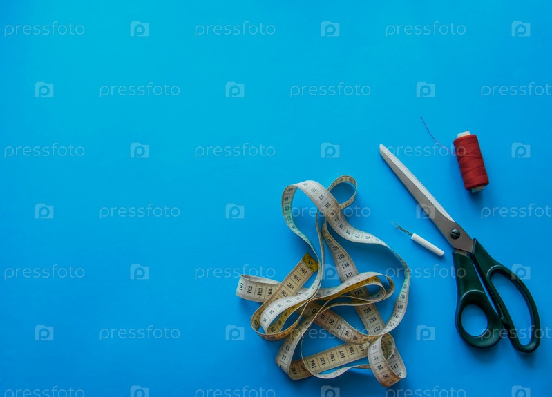 Инструменты для рукоделия, ножницы, портновский метр, катушка с нитками и вспарыватель на синем фоне