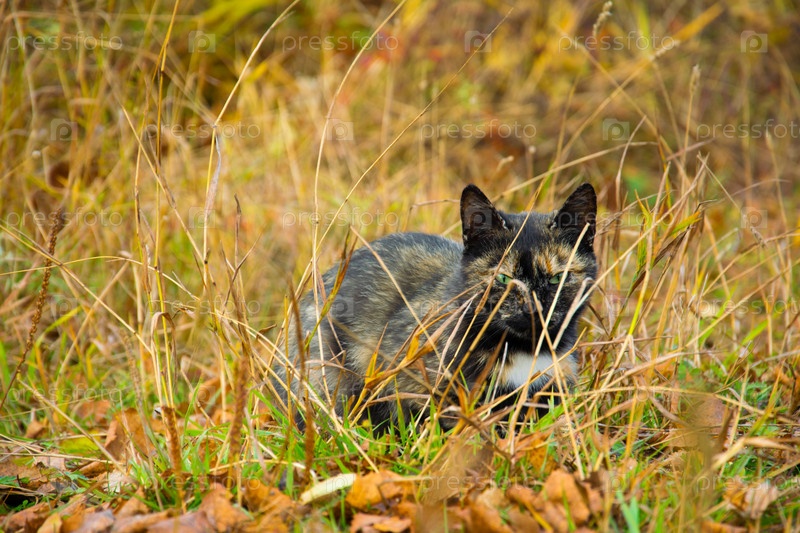 Коричневая пятнистая кошка с зелеными глазами осенью охотится в зеленой, оранжевой траве. Охота на мышей