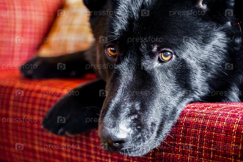 Черная немецкая овчарка лежит на диване