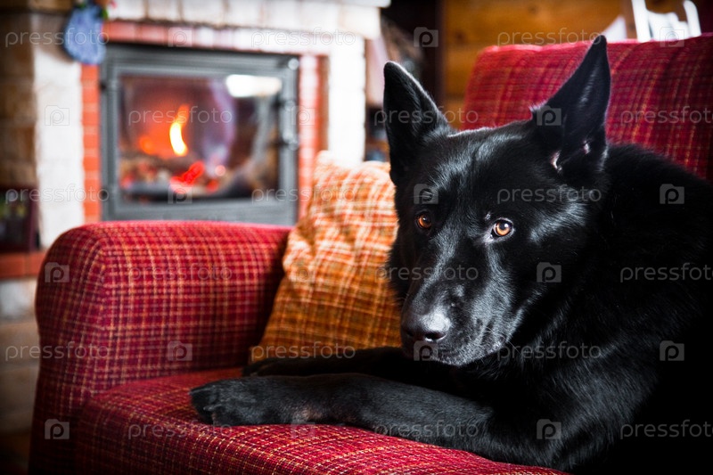 Черная немецкая овчарка лежит на диване на фоне камина в деревянном доме