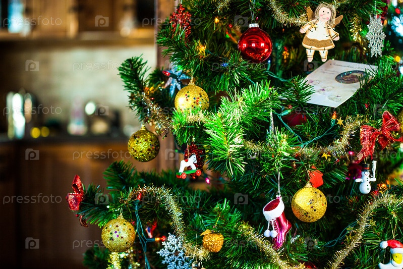 Новогодняя елка с разноцветными игрушками. Рождественская ель с украшениями