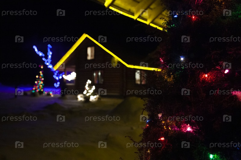 Деревянный дом в новогоднем оформлении светящимися гирляндами