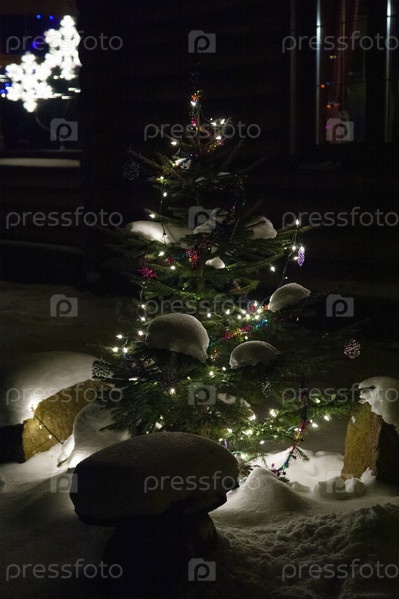 Ель в новогоднем оформлении светящимися гирляндами на фоне деревянного дома