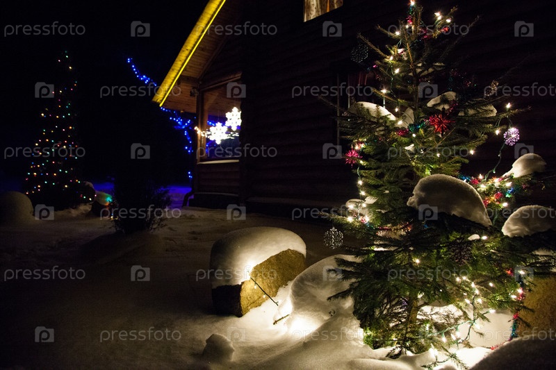 Деревянный дом в новогоднем оформлении светящимися гирляндами