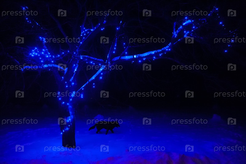 Новогоднее дерево в светящихся гирляндах на улице зимой