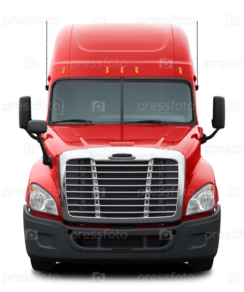 Красный грузовик Freightliner Cascadia с черным пластиковым бампером. вид спереди на белом фоне