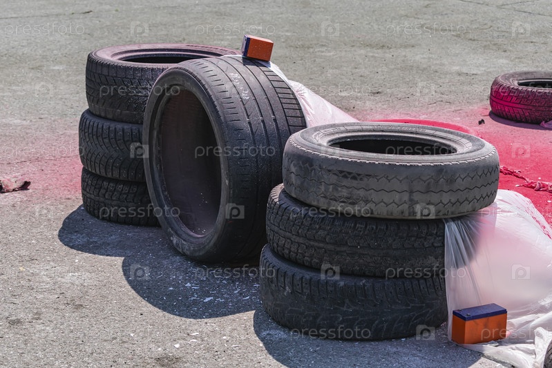 Старые изношенные автомобильные шины сложены для безопасности в случае аварий на гоночной трассе и покрыты полиэтиленом