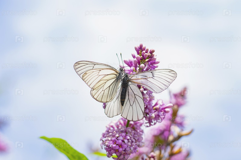Две капустные бабочки спариваются на цветке сирени. Насекомые белые бабочки во время размножения
