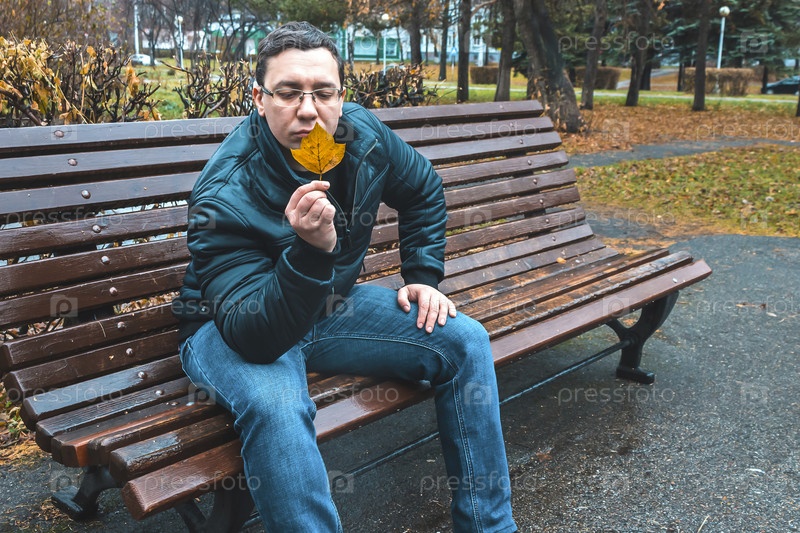 Мужчина держит в руках упавший осенний лист и смотрит на него, сидя на скамейке в парке