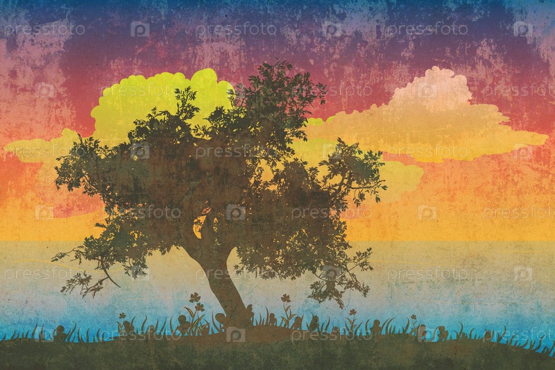 Силуэт дерева на закате гранж