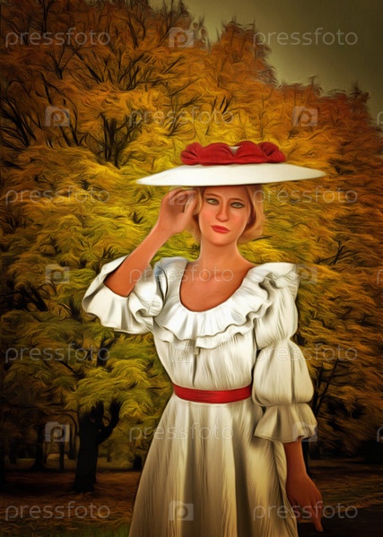 Женщина в винтажном белом платье и осенние деревья цифровое искусство
