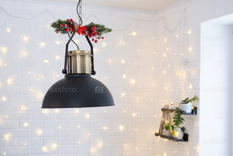 Черный абажур в индустриальном стиле лофт украшен еловыми ветками к Рождеству и Новому году на фоне гирлянд из волшебных огней. Крупный план, минимализм