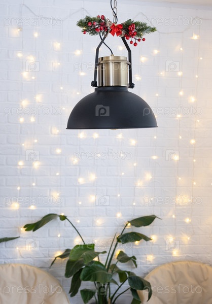 Рождественский интерьер дома в стиле лофт с черно украшенным ретро-абажуром и комнатными растениями Strelitzia nicolai